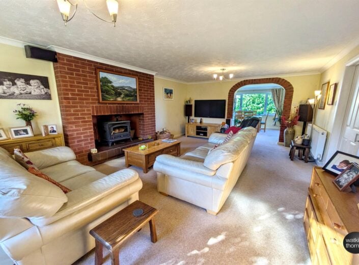 With front aspect double glazed window, two panelled radiators, television point, multi fuel stove with brick surround, coved ceiling, double doors to the kitchen/breakfast room and arch to the: