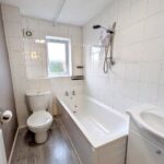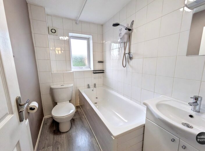 With front aspect double glazed window, suite comprising panel enclosed bath with electric shower over, vanity wash hand basin, low flush WC, panelled radiator, partially tiled wall surround, extractor fan, light with shaving point and vinyl flooring.