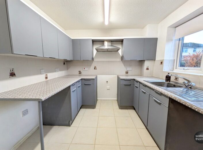 With front aspect double glazed window, a range of units comprising stainless steel sink drainer unit with work surface, tiled splashbacks, base units under, matching wall units, space for cooker with cooker hood over, space for washing machine, space for upright fridge/freezer and tiled flooring.