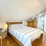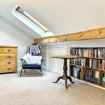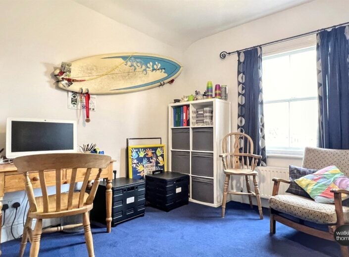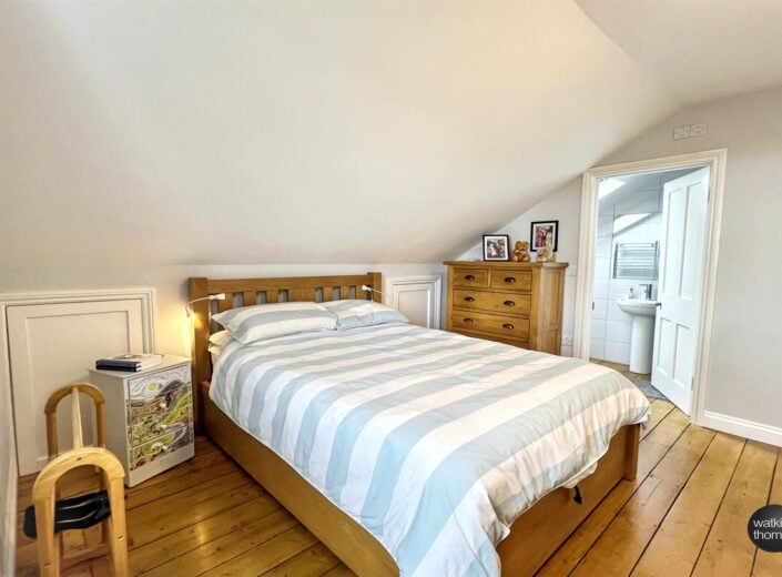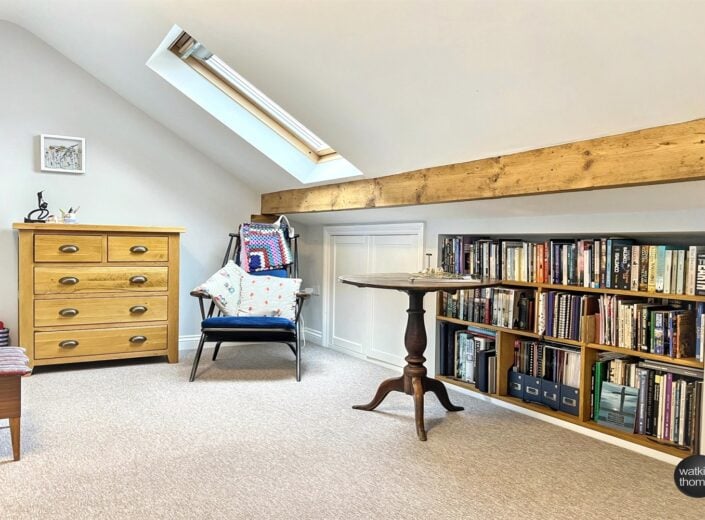 With velux roof light, stripped purlin, eaves storage cupboards, book shelving, radiator and with doors to a over-stair cupboard and full height door to a further over-stair cupboard (4'10 x 3') with hanging rail.