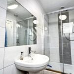 With white suite comprising shower cubicle with sliding screen doors and electric Mira Sport shower unit with extractor unit over, extensively tiled walls, pedestal wash basin with mixer tap and low level dual flush wc. Ladder radiator, exposed floor boards and velux roof light together with extractor unit.