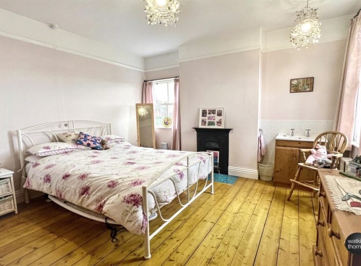 With a sash double glazed window to the side, secondary glazed sash window to the rear garden and with high level cabinets, picture rail, original cast fire surround with tiled hearth, exposed floor boards, radiator and vanity wash basin with tiled surround and cupboards below.