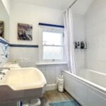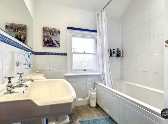 Immaculately presented with white suite comprising bath with tiled surrounds and thermostatically controlled shower unit over, pedestal wash basin and low level wc. Part tiled walls, sunken ceiling lights, extractor unit and sash window.