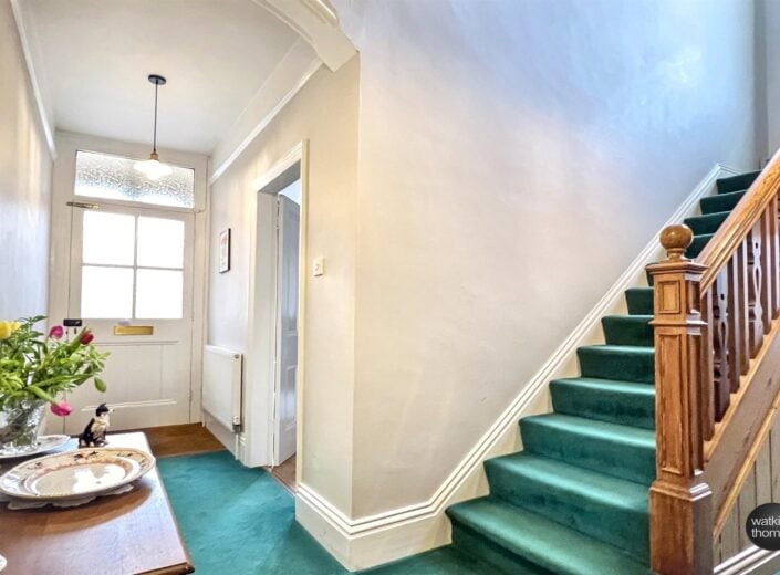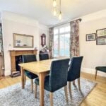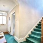 With a 6' wide recess off and with a wide stairway with wooden banister, hand rail and newel post to the first floor, double glazed window to the side, stripped panelling to under-stair area and door to the lower ground floor. Radiator, decorative archway, 9' high ceilings and picture rail. Mat-well, further radiator and with doors to the kitchen/breakfast room, the dining room and the: