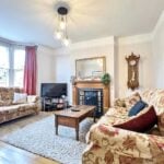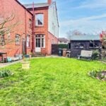 With a double glazed sash window to the side and with a casement door with adjacent original window opening to and overlooking the rear garden with windows over. This room again has a 9' ceiling height, picture rail, exposed floor boards and with a timber fire surround with harlequin tiled floor and wood burning stove.