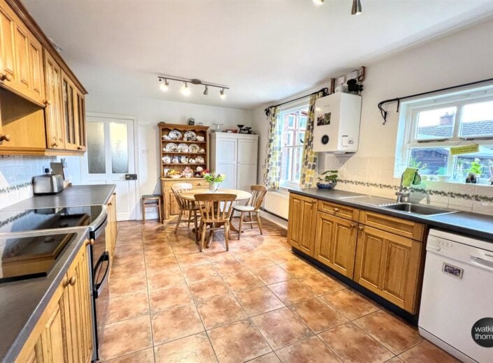 With a sash window and double glazed window to the side, radiator, wall mounted gas fired boiler, providing central heating and domestic hot water and with two walls having fitted units including the first with a single drainer sink unit with mixer tap over and drainer, base cupboards, working surface, plumbing for dishwasher and with tiled surrounds. To the second wall there is again a run of wood fronted base cupboard units with roll edged working surface over, tiled surrounds and eye level cabinets together with glass fronted units and open shelving. Recess with space for oven and with recess with plumbing for washing machine with shelving over, ceramic floor tiles, two sets of ceiling spot light fittings and with double glazed French doors opening to the rear garden area and with a door to: