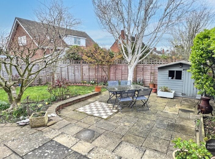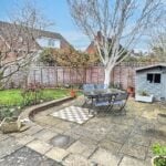 Ironwork between brick posts with decorative stones over and a gate opens to the front hard-standing garden area. To the left of the driveway there is an ornamental tree. To the side there is a Wisteria and the side garden is bounded by a Yew hedge. Within the hedge there is a gate opening to the rear garden and a paving stone pathway leads to the rear hard landscaped garden/sun terrace/entertaining area. There is a lawned garden area with part brick edge with flower borders beyond, a Wendy house, Silver Birch, deep beds and borders and a WORKSHOP/STORE.