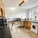 With two sets of double glazed windows opening to and overlooking the rear garden, double glazed door to the side, tiled floor, cupboard in which is housed the wall mounted gas fired boiler which provides central heating and domestic hot water and extensively fitted with solid wood fronted base cupboard units with roll edge working surfaces over, tiled surrounds and matching eye level cabinets. Breakfast bar area, radiator and with a single drainer stainless steel sink unit with plumbing below for washing machine, built in dishwasher and with a built in oven and a four ring gas hob with hood above.