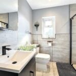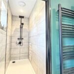 With a deep walk in shower area with tiled walls and twin headed thermostatically controlled shower unit. Sunken ceiling lights, two double glazed windows, part tiled surrounds and with a vanity wash basin with a mixer tap with cupboards below together with low level WC. Part tiled walls, tiled floor and ladder type radiator.