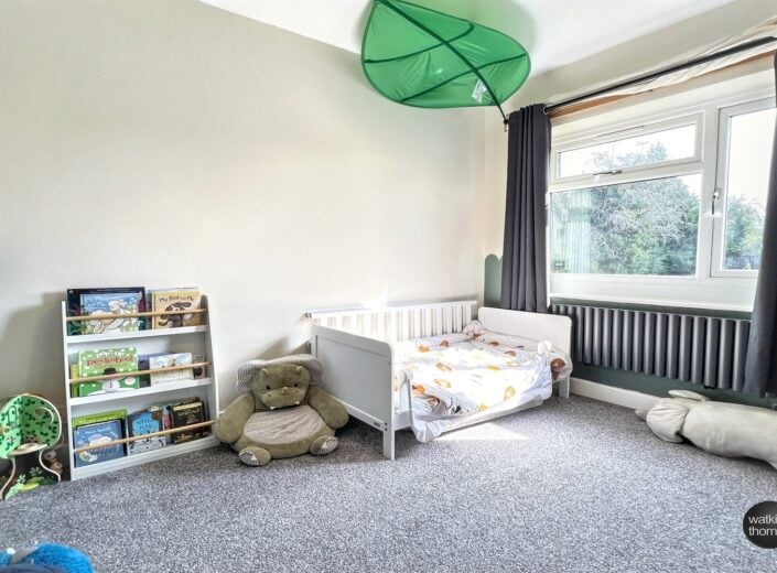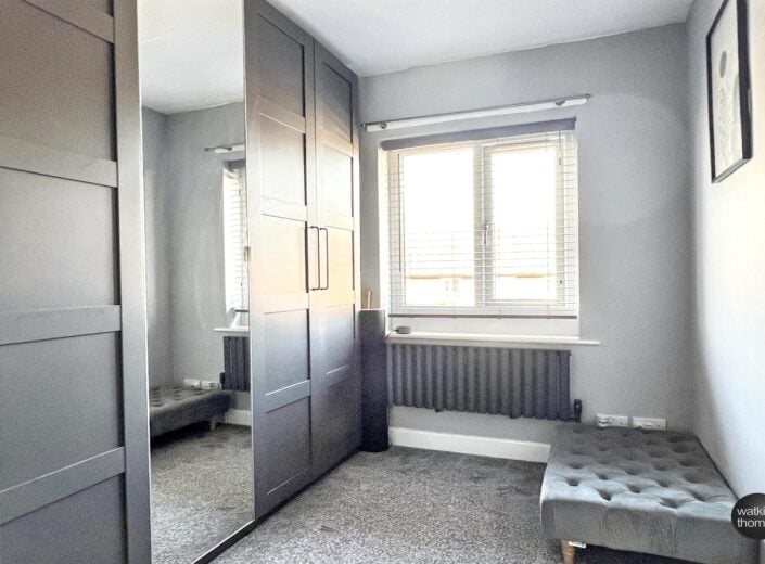 With a double glazed window overlooking the garden at the rear. Contemporary style radiator and a pair of recessed storage cupboards.