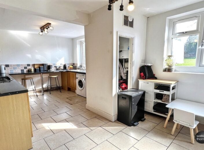 With two sets of double glazed windows opening to and overlooking the rear garden, double glazed door to the side, tiled floor, cupboard in which is housed the wall mounted gas fired boiler which provides central heating and domestic hot water and extensively fitted with solid wood fronted base cupboard units with roll edge working surfaces over, tiled surrounds and matching eye level cabinets. Breakfast bar area, radiator and with a single drainer stainless steel sink unit with plumbing below for washing machine, built in dishwasher and with a built in oven and a four ring gas hob with hood above.
