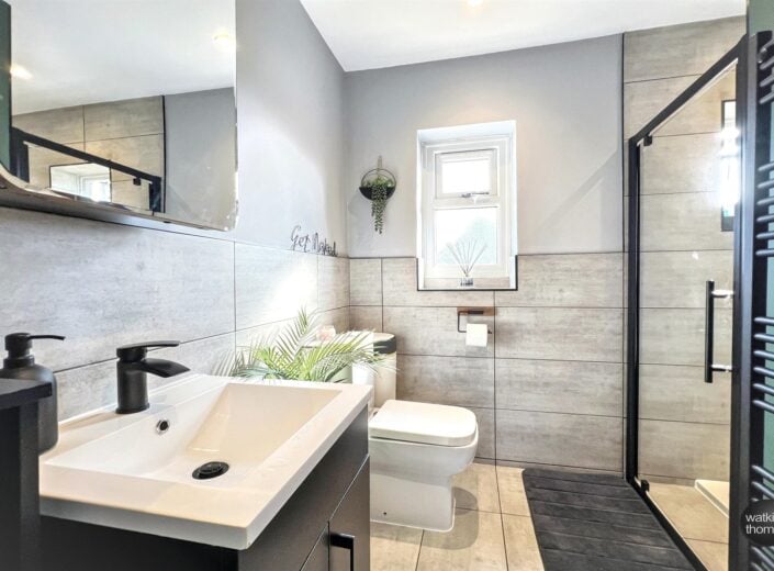 With a deep walk in shower area with tiled walls and twin headed thermostatically controlled shower unit. Sunken ceiling lights, two double glazed windows, part tiled surrounds and with a vanity wash basin with a mixer tap with cupboards below together with low level WC. Part tiled walls, tiled floor and ladder type radiator.