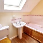 Irregular shaped room with rear aspect velux skylight, low flush WC, pedestal mounted wash hand basin with tiled splashbacks, panel enclosed bath, partially tiled wall surround, panelled radiator and reduced head height to one section of the room.