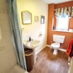 With rear aspect double glazed window, suite comprising low flush WC, pedestal mounted wash hand basin with tiled splashback, shower tray with electric shower over and shower curtain. Partially tiled wall surround, shaver point, panelled radiator and vinyl flooring.