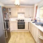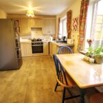 With two rear aspect double glazed windows, a range of units comprising one and a half bowl sink drainer unit with work surfaces, tiled splashbacks, base units under with matching wall units, integrated electric oven and gas hob with cooker hood over, space for upright fridge/freezer, under stairs storage cupboard, panelled radiator, vinyl flooring and door to the garage.
