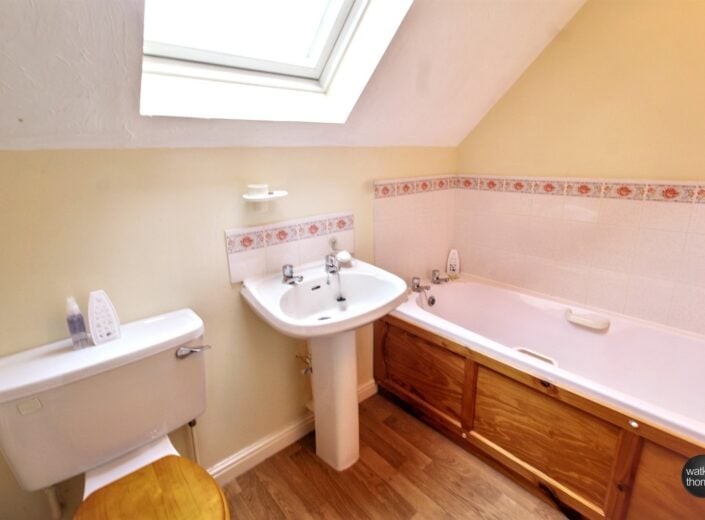 Irregular shaped room with rear aspect velux skylight, low flush WC, pedestal mounted wash hand basin with tiled splashbacks, panel enclosed bath, partially tiled wall surround, panelled radiator and reduced head height to one section of the room.