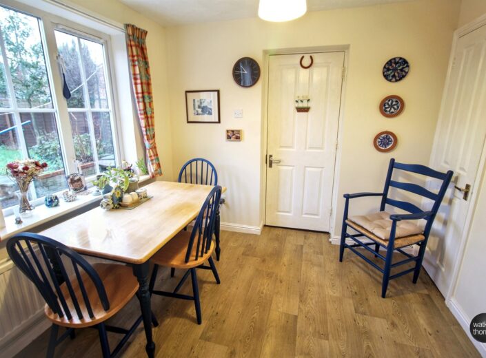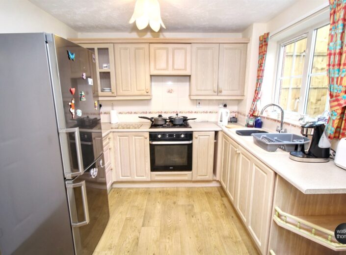 With two rear aspect double glazed windows, a range of units comprising one and a half bowl sink drainer unit with work surfaces, tiled splashbacks, base units under with matching wall units, integrated electric oven and gas hob with cooker hood over, space for upright fridge/freezer, under stairs storage cupboard, panelled radiator, vinyl flooring and door to the garage.
