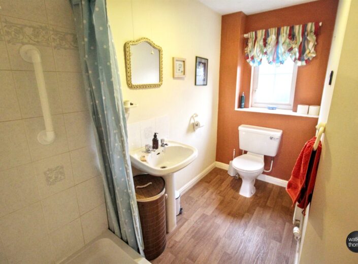 With rear aspect double glazed window, suite comprising low flush WC, pedestal mounted wash hand basin with tiled splashback, shower tray with electric shower over and shower curtain. Partially tiled wall surround, shaver point, panelled radiator and vinyl flooring.