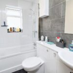 With side aspect double glazed window, with suite comprising panel enclosed bath with mixer tap and thermostatically controlled shower over. Partially tiled wall surround, vanity wash hand basin, low flush WC, shower boarding around the bath and tiled flooring.