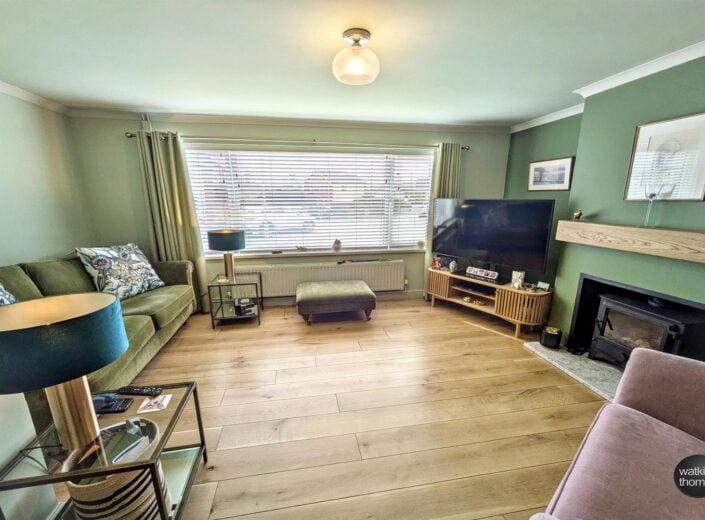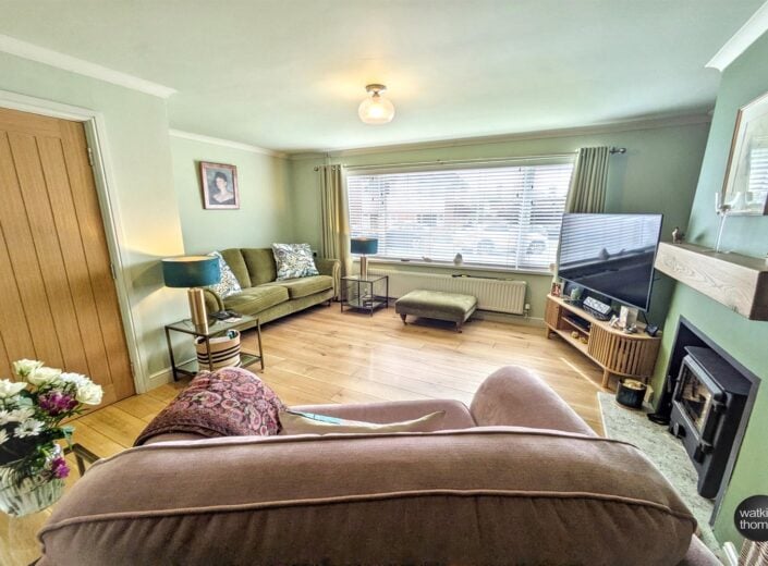 With front aspect double glazed window, wood burning stove with oak mantel over, coved ceiling, engineered oak flooring, panelled radiator and under stairs storage cupboard.