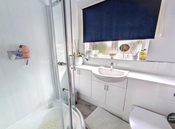 With side aspect double glazed window, shower cubicle, thermostatically controlled shower, low level wc, vanity wash hand basin, heated towel rail, shower boarded surrounds, extractor fan spot lights and vinyl flooring.