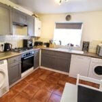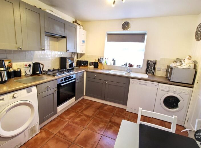 With front and side aspect double glazed windows, a range of units comprising one and a half bowl sink drainer unit, work surface, tiled splashbacks, base units under with matching wall units, integrated electric oven, integrated gas hob with cooker hood over, a range of wall and base mounted units, larder cupboard, space for upright fridge/freezer, wall mounted gas central heating boiler, plumbing and space for washing machine, plumbing and space for dishwasher and space for tumble dryer.