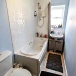 With shower cubicle with electric shower, low flush WC, pedestal mounted wash hand basin, partially tiled wall surround, shaver point, panelled radiator, extractor fan and vinyl flooring.