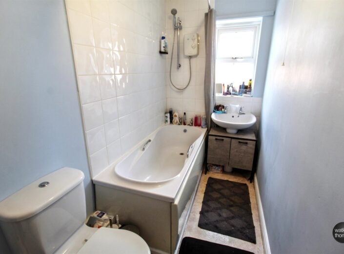 With side aspect double glazed window, suite comprising panel enclosed bath, electric shower over, low flush WC, pedestal mounted wash hand basin, partially tiled wall surround, panelled radiator, airing cupboard and vinyl flooring.