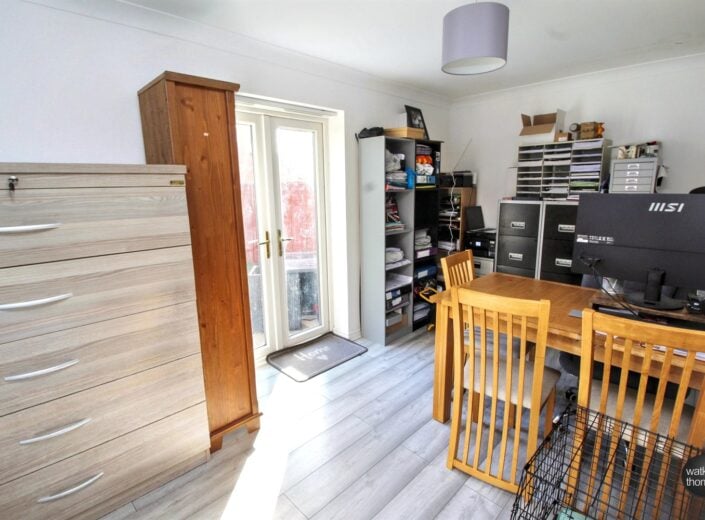 Front aspect double glazed window, panelled radiator, coved ceiling, laminated flooring, door to the cloakroom and side aspect double glazed doors giving access to the rear garden.