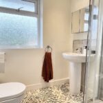 With shower cubicle with tiled walls and thermostatically controlled twin headed shower unit, pedestal wash basin with tile over and low level WC. Double glazed window, ladder type radiator and extractor unit together with sunken ceiling lights.