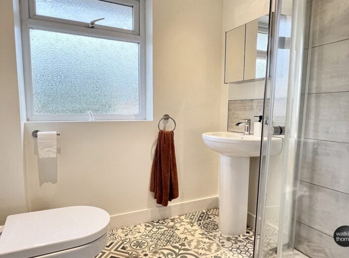 With shower cubicle with tiled walls and thermostatically controlled twin headed shower unit, pedestal wash basin with tile over and low level WC. Double glazed window, ladder type radiator and extractor unit together with sunken ceiling lights.
