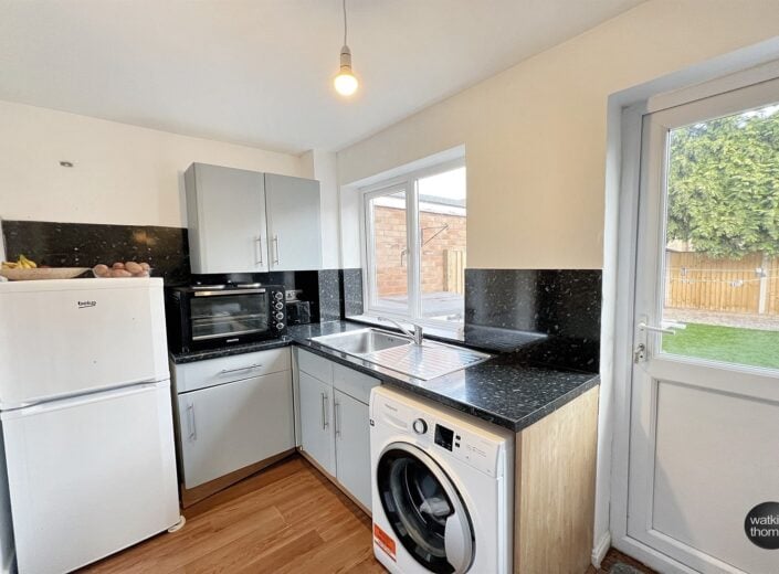 With a double glazed window to the rear, double glazed door to the rear and with fitted base cupboards with working surface over, matching upstands and double, single and glass fronted eye level cabinets. Built in oven with four ring hob over and stainless steel splashback, recess with plumbing for washing machine, single drainer sink unit with drainer and mixer tap and with recess for upright fridge freezer. Wood laminate flooring.