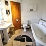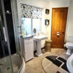 With rear aspect double glazed window, suite comprising roll top bath, shower cubicle with multi-jet shower and blue tooth speaker system, low flush wc, pedestal mounted wash hand basin, airing cupboard, panelled radiator and vinyl flooring.