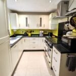 With a range of units comprising 1½ bowl ceramic sink unit with work surfaces, tiled splash backs, base units under with matching wall units, integrated fridge freezer, integrated dishwasher, range cooker with cooker hood over, inset spot lights, tiled flooring and door to utility room.