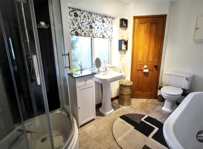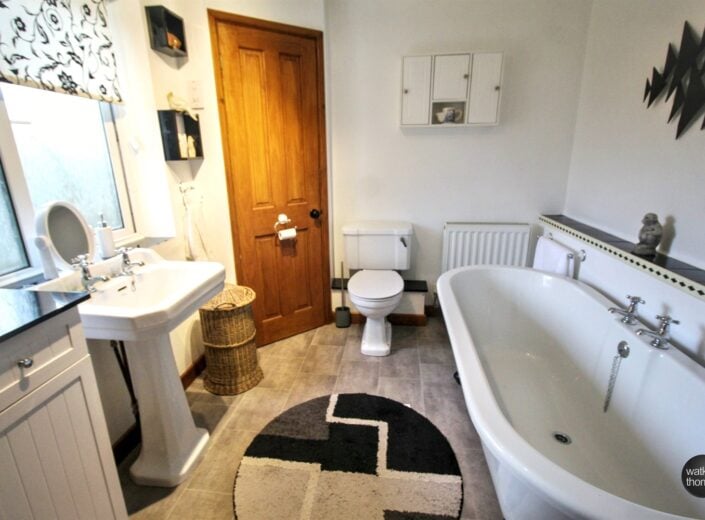 With rear aspect double glazed window, suite comprising roll top bath, shower cubicle with multi-jet shower and blue tooth speaker system, low flush wc, pedestal mounted wash hand basin, airing cupboard, panelled radiator and vinyl flooring.
