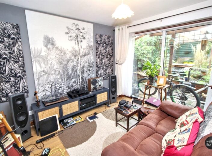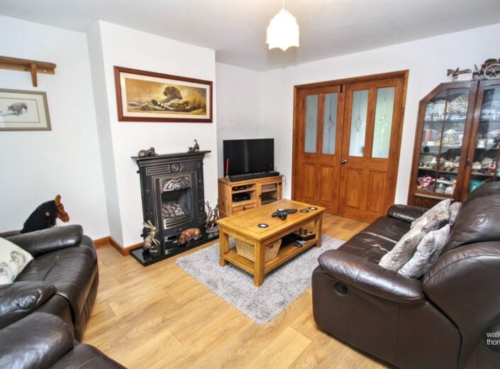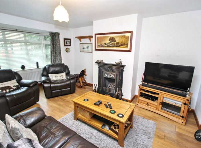 With front aspect double glazed bay window, gas fire with decorative surround, laminated flooring, television point, panelled radiators and double doors to the family room.