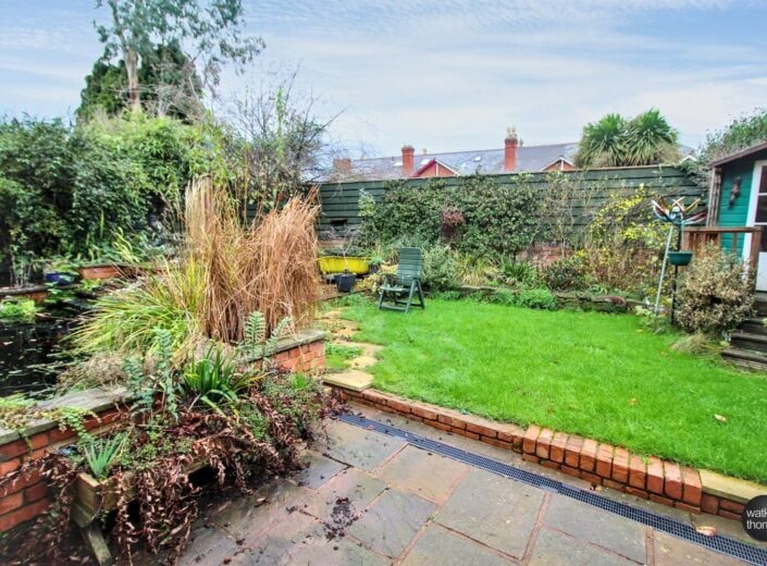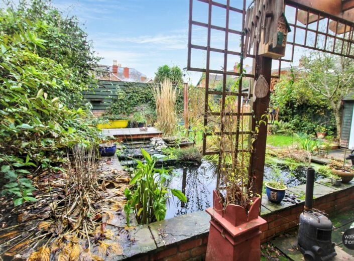 A side path gives access to the rear garden where there is a patio with steps leading to a decked seating area which overlooks a pond. There is a lawn garden with shrub borders, useful summer house and storage shed. Outside tap. The garden is enclosed by fencing to provide a degree of privacy.