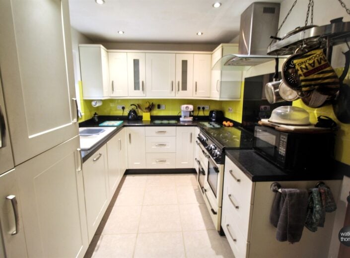 With a range of units comprising 1½ bowl ceramic sink unit with work surfaces, tiled splash backs, base units under with matching wall units, integrated fridge freezer, integrated dishwasher, range cooker with cooker hood over, inset spot lights, tiled flooring and door to utility room.