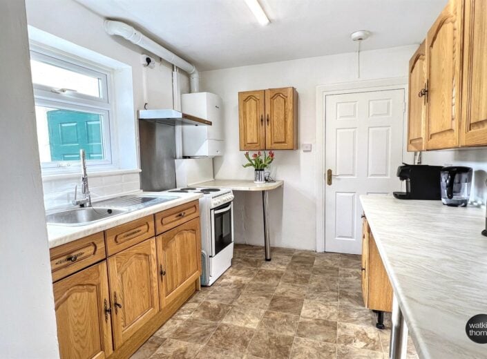 With a double glazed window to the side and with a flexible head mixer tap and single drainer sink unit, fitted base cupboards with working surface over, part with tiled surrounds, breakfast bar area and with matching wood fronted eye level cabinets. Cooker splashback with hood over, space for washing machine, space for a further appliance and having a door to the rear porch and door to;