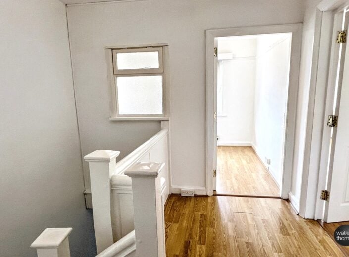 Approached over a stairway which has a door to bedroom 4 and with access hatch with ladder to loft space. Wood laminate flooring and with doors to the separate WC, bathroom and bedrooms 2, 3 and;