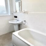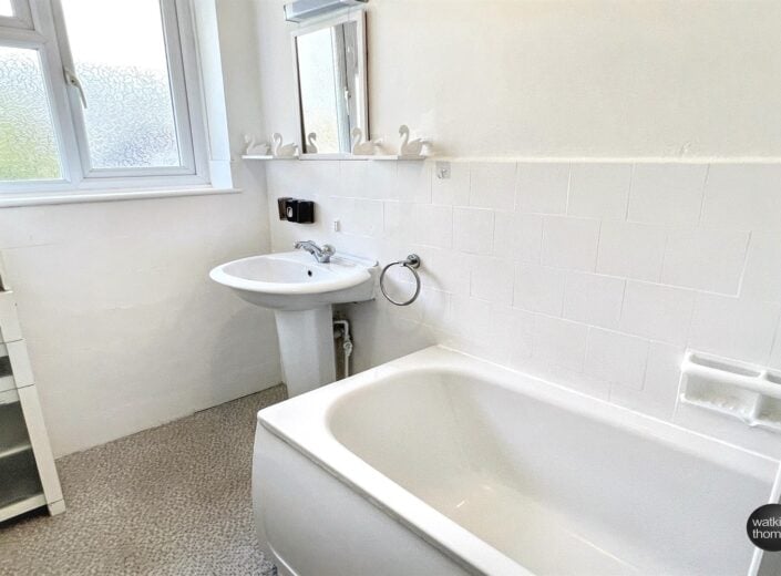 With suite comprising bath with mixer tap and shower head attachment, together with pedestal wash basin. Double glazed window, radiator and part tiled walls.