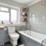 Well appointed and with white suite comprising low level WC and wash basin with mixer tap. Deep wooden window sill, sunken ceiling lights and continuation of tiled floor together with a wall mounted ladder radiator.