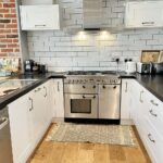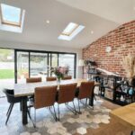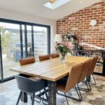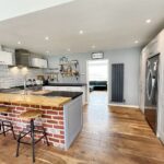 A beautiful open plan space with triple doors, two of which are sliding, opening to and overlooking the rear garden. Part pitched roof with velux lights, sunken ceiling lights and with exposed brick wall and beautiful timber floor broken up by a sector of bespoke honeycomb tiles. Within the kitchen area, there is a single stainless steel sink unit with drainer and flexible mixer tap, fitted soft close base cupboards and drawer units with working surfaces over, including carousel corner units. Brick effect tiled course over in part and with stainless steel cooker hood above. High cabinets, recess with plumbing for dishwasher, recess for an American style freezer and further tall storage cupboards. Two contemporary style radiators and wooden breakfast bar. Oak door to study and oak door to;