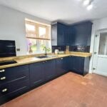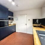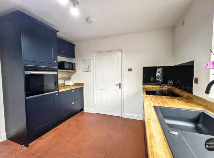 With an attractive range of base cupboards and drawer units with soft close doors and having wood block working surfaces over, small brick effect tiled surrounds and with eye level cabinets. Shelving and with a composite sink unit with drainer and mixer tap, built in hob with splashback, built in dishwasher and built in electric oven with housing above and below. Ceiling strip lights, quarry tiled flooring, second door to the hallway and door to side passage.