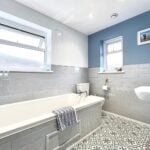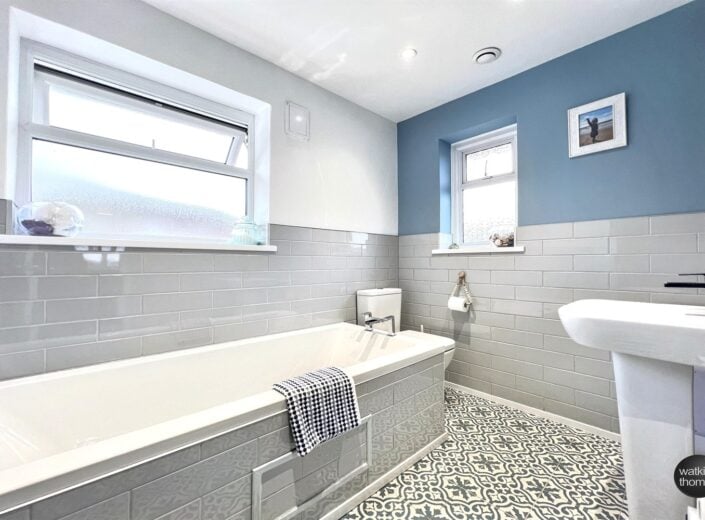With modern white suite comprising bath, low level WC and pedestal wash basin with mixer tap. Part tiled walls, sunken ceiling lights, extractor unit, two double glazed windows, feature tiling to floor and ladder type radiator.