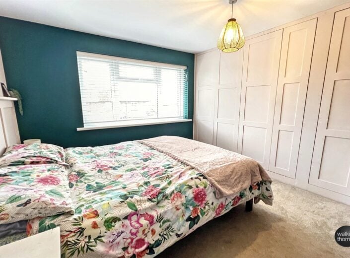 With a double glazed window to the front, part panelling to wall around head of bed, contemporary style radiator, painted floorboards and along one wall there are three sets of double doors and two single doors to the wardrobe areas.