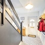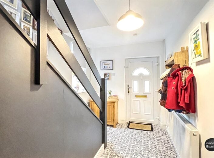 With stairway off, double glazed window to the side, radiator, wall mounted thermostat, door to under stair store cupboard and with a feature tile effect floor. Doors to kitchen and;