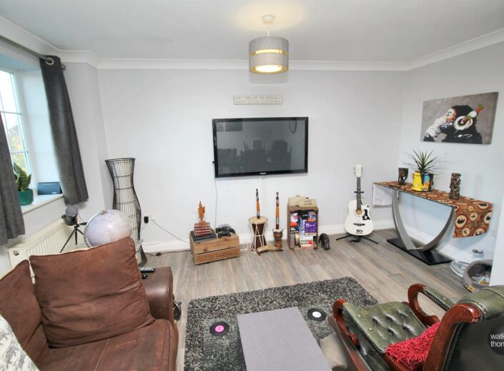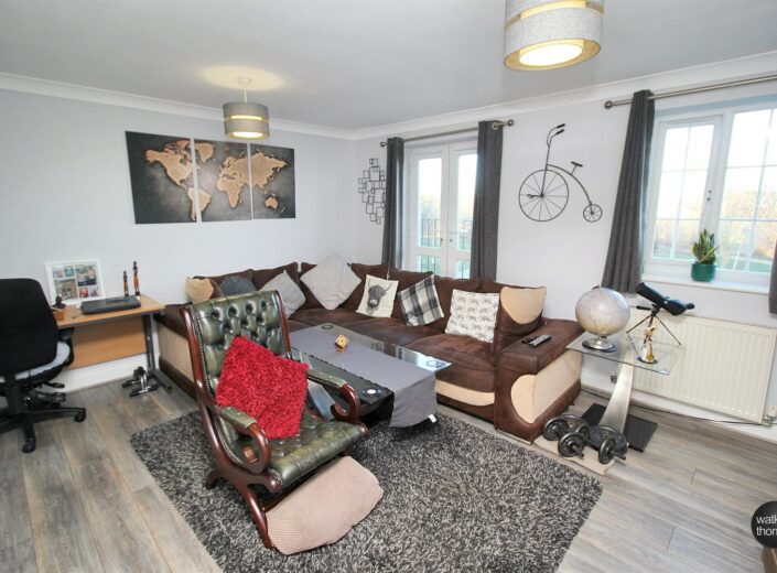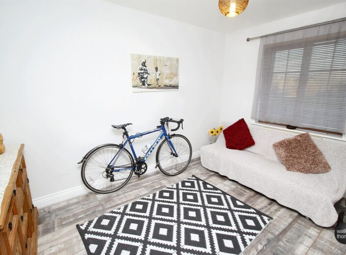 With rear aspect double glazed window, rear aspect double glazed French doors to Juliette balcony, television point, coved ceiling, laminated flooring and panelled radiator.