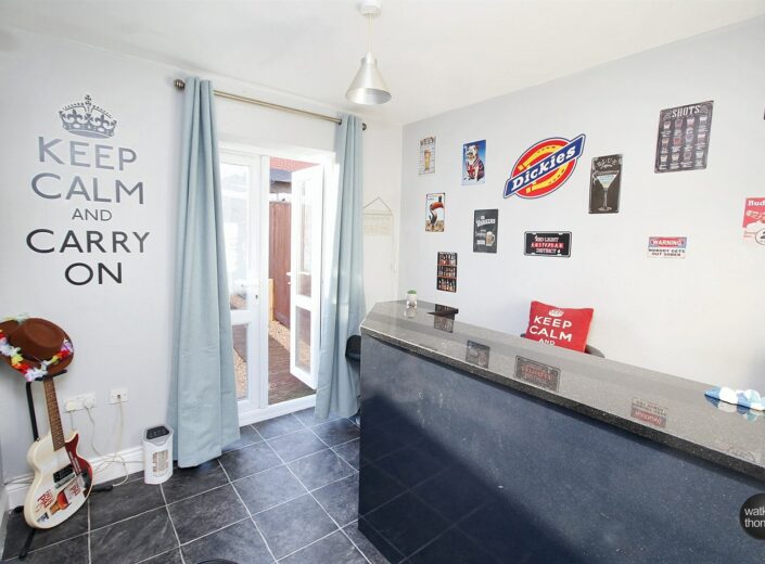 With rear aspect double glazed French doors, built-in bar and panelled radiator.