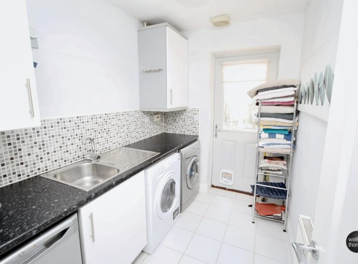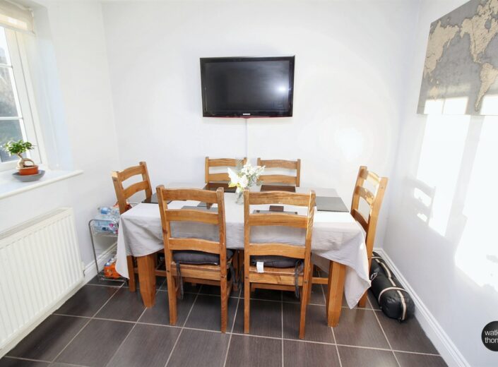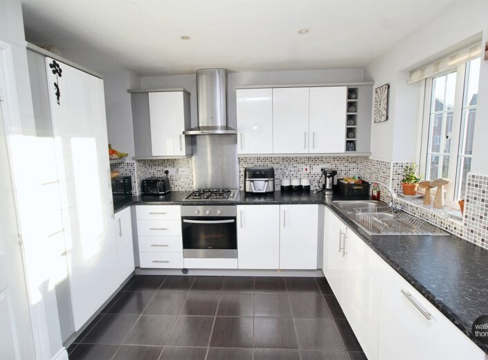 With two rear aspect double glazed windows, a range of units comprising a stainless steel 1½ bowl mixer unit with work surfaces, tiled splash backs, base units under with matching wall units, integrated electric oven and hob with cooker hood over, integrated dishwasher, integrated fridge freezer, panelled radiator, tiled flooring and space for dining table.